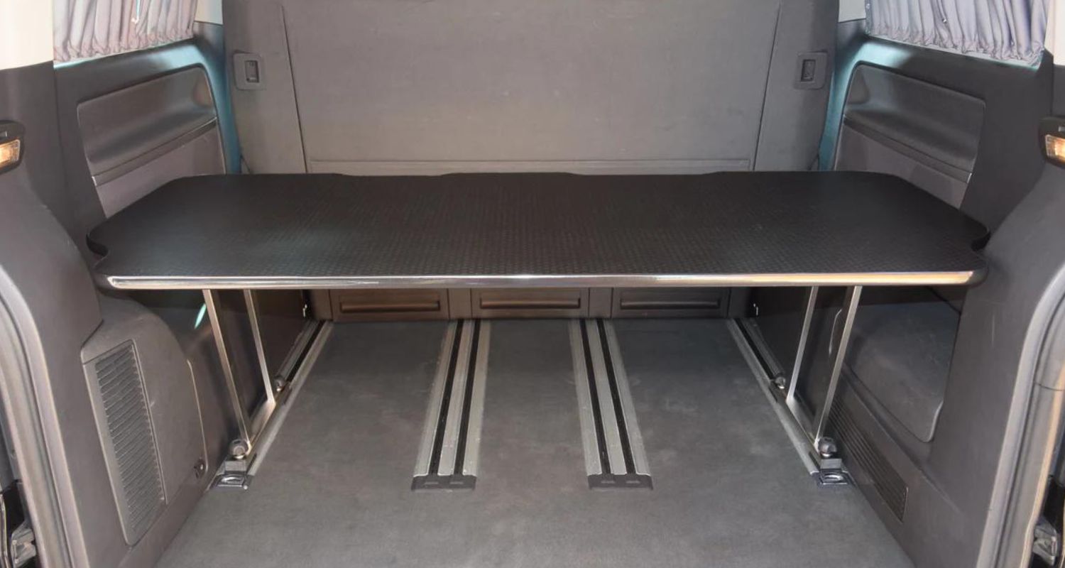Multiflexboard o Multiflex es una estructura multifuncional plegable para Volkswagen T5/T6/T6.1 que se puede utilizar como extensión de cama, como mesa o como asiento. Generalmente se coloca en la parte posterior del asiento trasero de estas furgonetas camper para prolongar la longitud de la cama hasta los 185 – 200 cm. Se trata, en definitiva, de un accesorio camper que te permitirá dormir «a pierna suelta» en tu furgoneta como lo harías en la cama de tu casa.